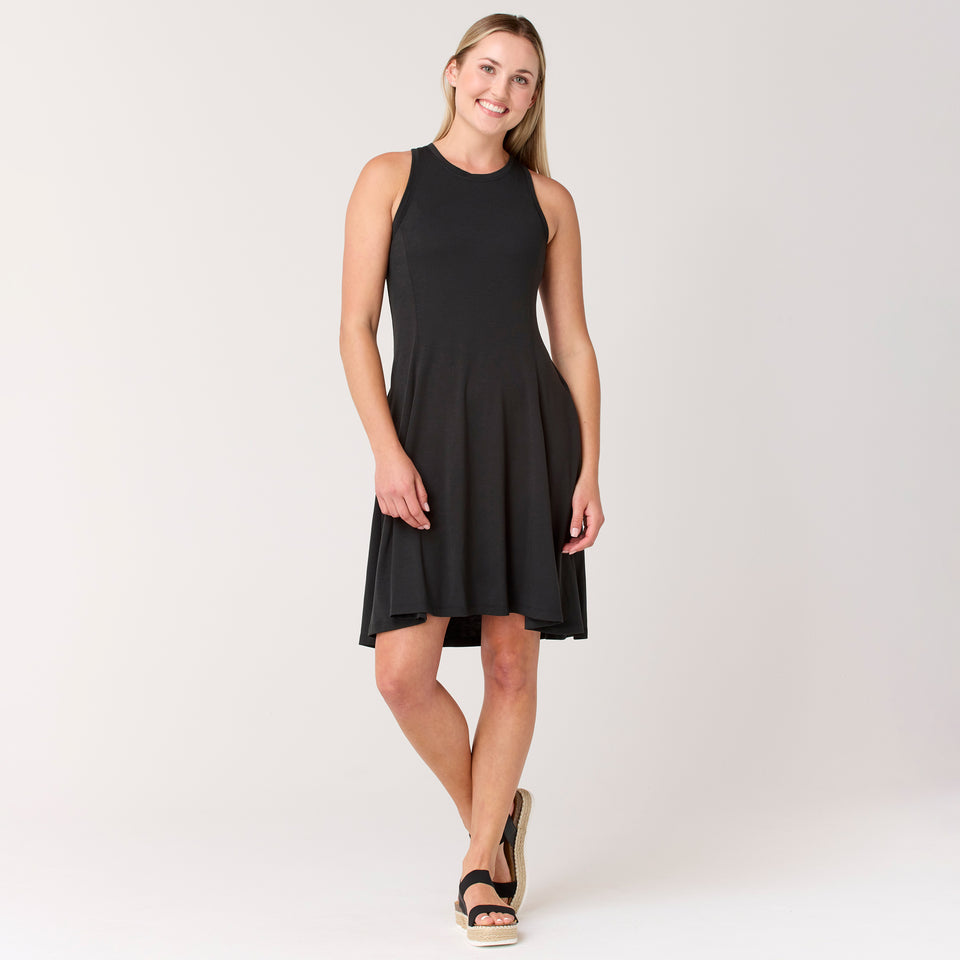 This sleeveless, A-line silhouette is the perfect dress for your summer. Complete with pockets and a crew neckline.